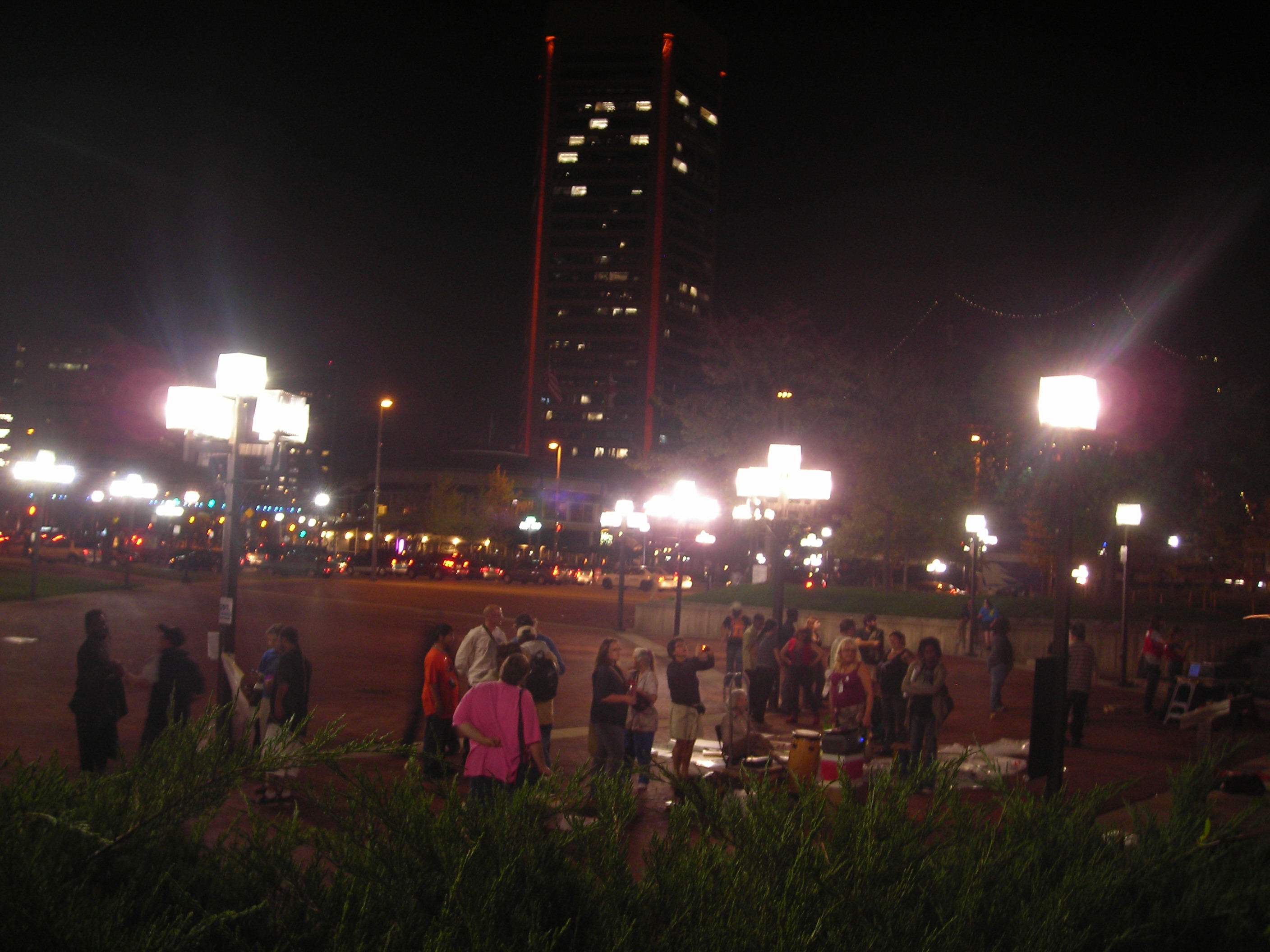 A few days later we had established “Occupy Baltimore” in McKeldin plaza, on the corner of Pratt & Light Streets in downtown Baltimore. The location was perfect. To the north, menacing skyscrapers with bank logos. To the east, the Inner Harbor: a tourist attraction that screams classism through its contrast with the rest of the city. Behind us, a boxy concrete structure served as a flexible backdrop. Although we had trouble listing our “goals”, we did craft a statement of purpose: